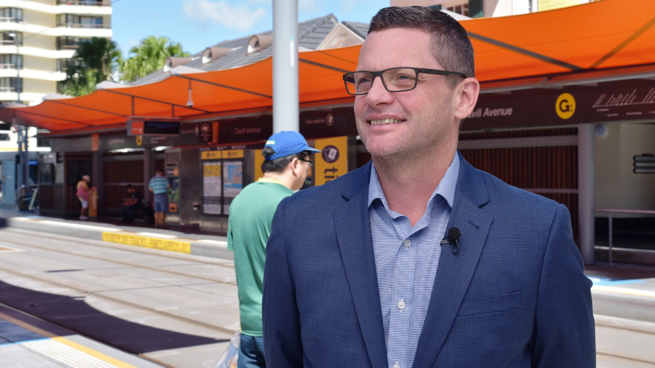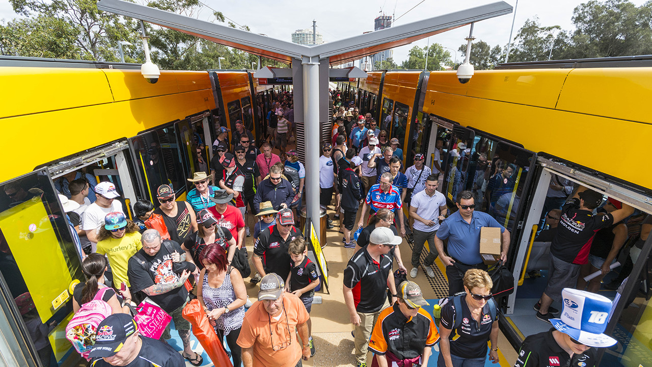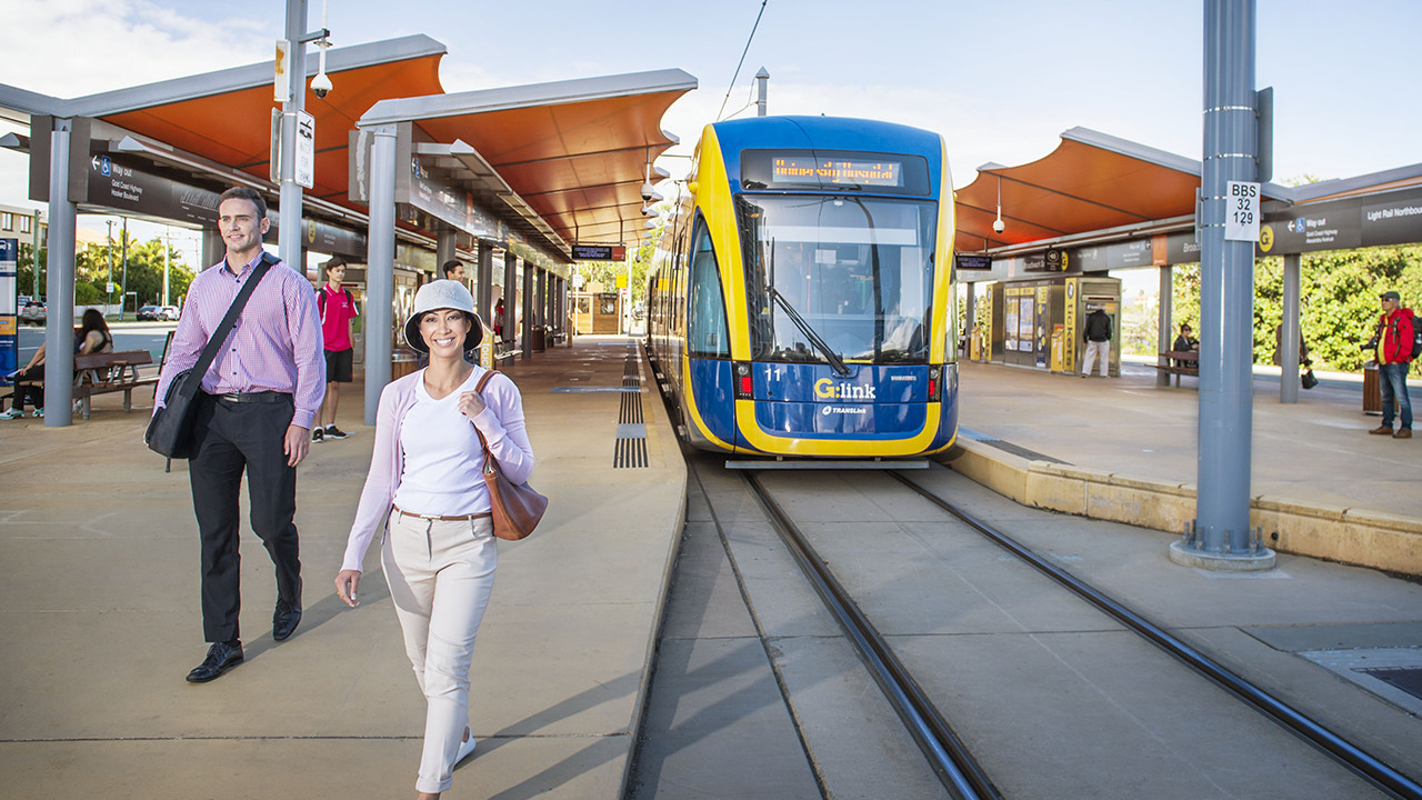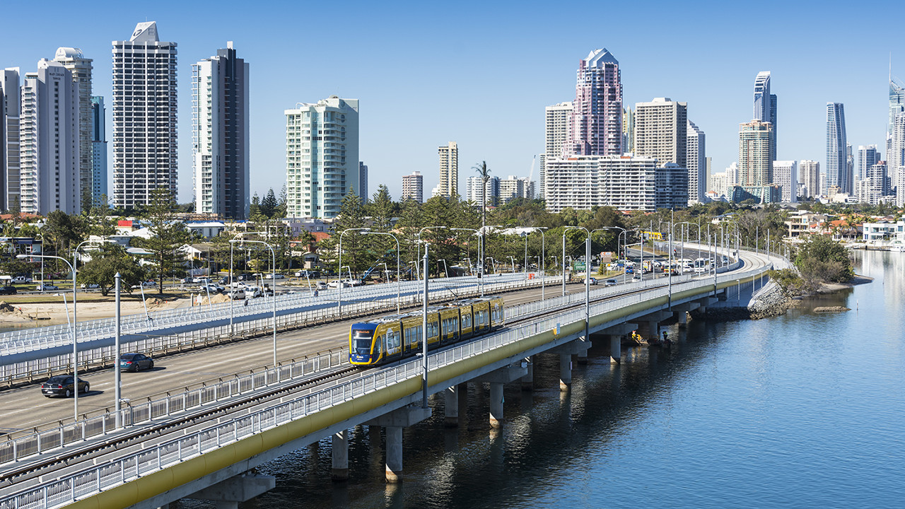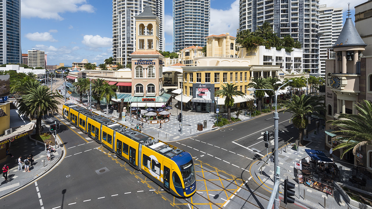 The sleek tram glides quietly into the busy station on Australia’s famed Gold Coast resort; local residents and tourists exit through the large sliding doors with their swim gear and surfboards for a day at the beach.