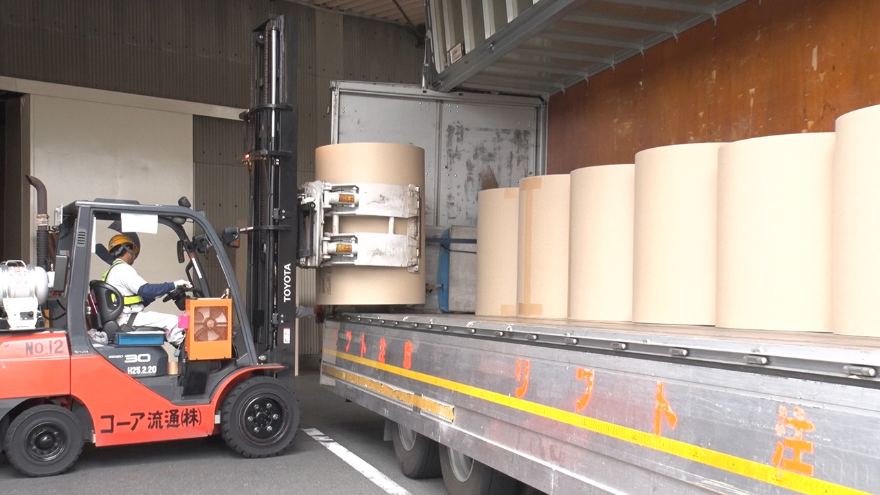 What seems like an ordinary shipping process actually has hidden considerations for the environment. Each base paper roll weighs several hundred kilograms, and the dozen or so forklifts that carry them from the warehouse to the trucks have all been remodeled to be powered by LPG. This is because the exhaust gas from gasoline or diesel fuel would accumulate in the warehouse, and may affect the health of the workers and the environment of the nearby residents.