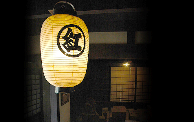 Lit lanterns with the Chinese character for “Beni” [紅] enclosed in a circle printed on them are set up along the dirt floor. -