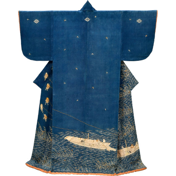 Itoh Chubei first began business trips to sell linen cloth in 1858. On his first trip, after traveling down the Yodo River from Kyoto to Osaka, he went to Senshu and Kishu. Kosode with Towboats on the Yodo River depicts the scenery of the Yodo River, which Itoh also passed through, and is a priceless garment that elicits imagery surrounding the spirit of Marubeni's founding.